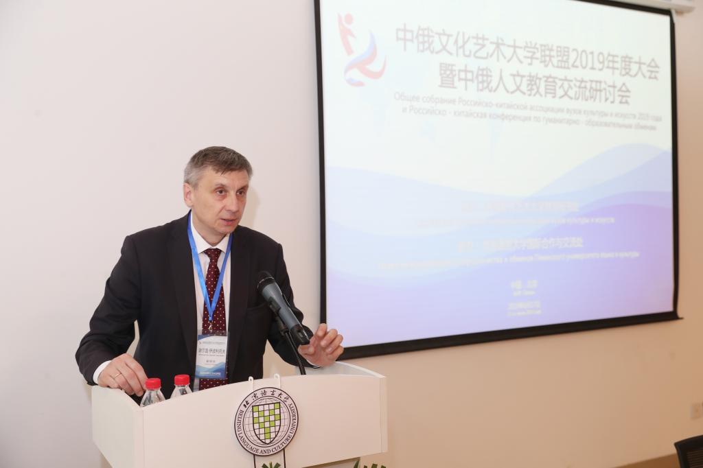 谢尔盖·伊波利托夫副校长作为俄方牵头院校的代表出席本次大会并做主旨演讲,他提出,本次联盟大会旨在拉进两国人民距离,深化高校之间合作。双方可通过共同出版学术类刊物,合办中俄艺术文化活动等形式提高联盟活跃度,推动联盟发展。