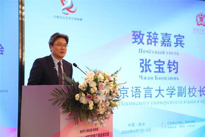 北京语言大学副校长张宝钧代表中俄文化艺术大学联盟秘书处致辞,他指出,联盟2019年召开了第一次会议,2021年因为疫情在线上举办了第二届盟会,2023年我们终于相聚河南师大、面对面共商合作。北京语言大学将继续履行秘书处职责,希望今后联盟每年召开一次大会,总结共同交往的成果和经验,推动联盟内高校人才培养教育教学合作,也希望更多中国高校能够参与到联盟中来,为两国青年的友好交流和两国友谊做出重要贡献。